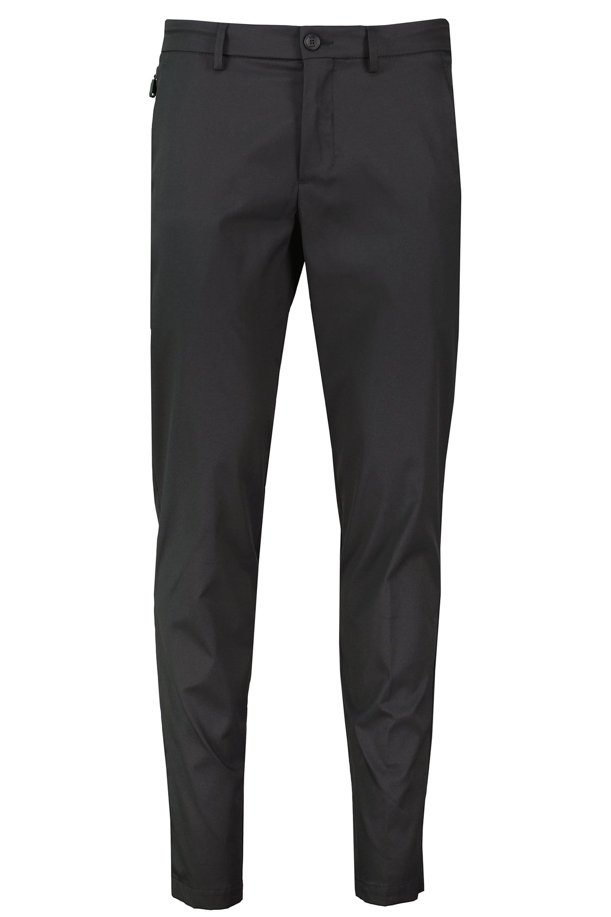 BOSS Four-Way Stretch Performance Trousers 50541368-BLK in black, constructed from 100% polyester techweave with twill finish and DWR coating for stretch comfort.