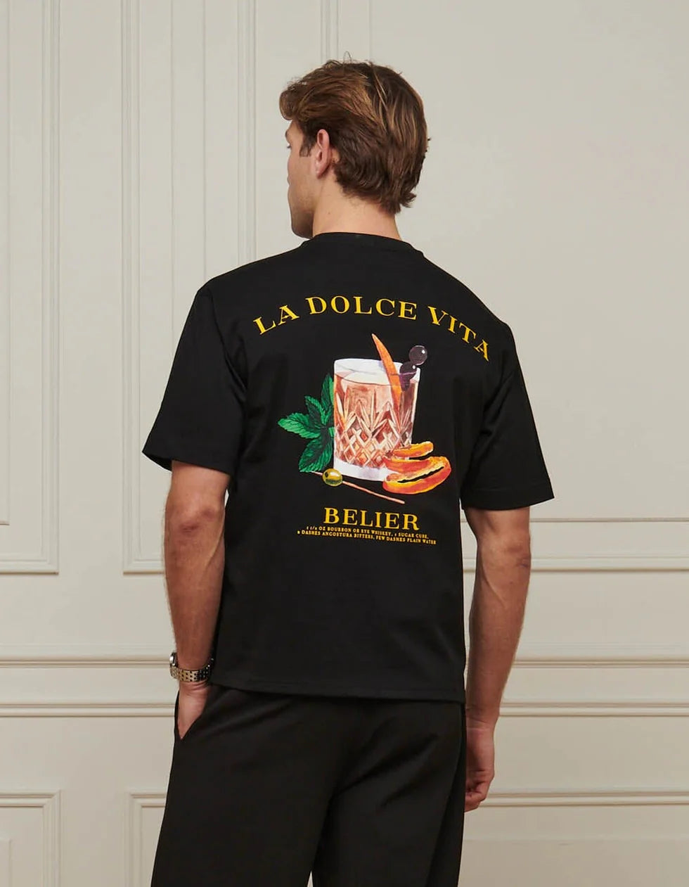 Men's Belier Black Old Fashioned back graphic T-Shirt. It features a relaxed fit and a vibrant premium print showcasing a classic Old Fashioned drink, symbolizing timeless elegance. The shirt bears the slogan "La Dolce Vita," meaning "The Good Life," adding a sophisticated touch to your casual wardrobe.
