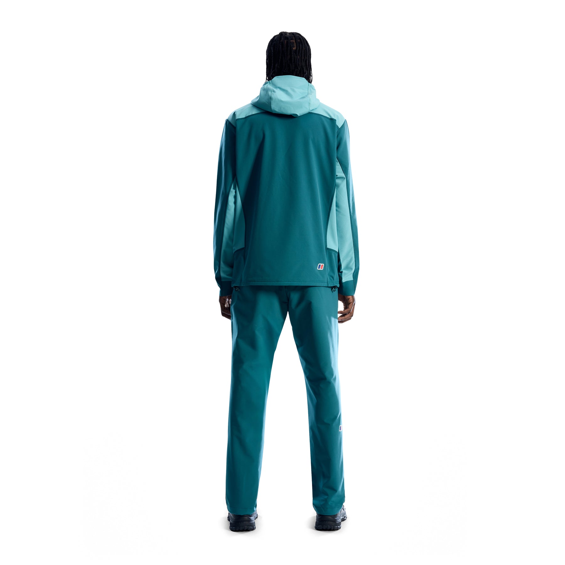 Men's Berghaus softshell jacket constructed from 100% polyester. Lightweight, moisture-wicking fabric with bonded hood peak, flatlock seam detailing, two-point bungee hem adjustment, two zipped hand pockets and half-ribbed cuffs.