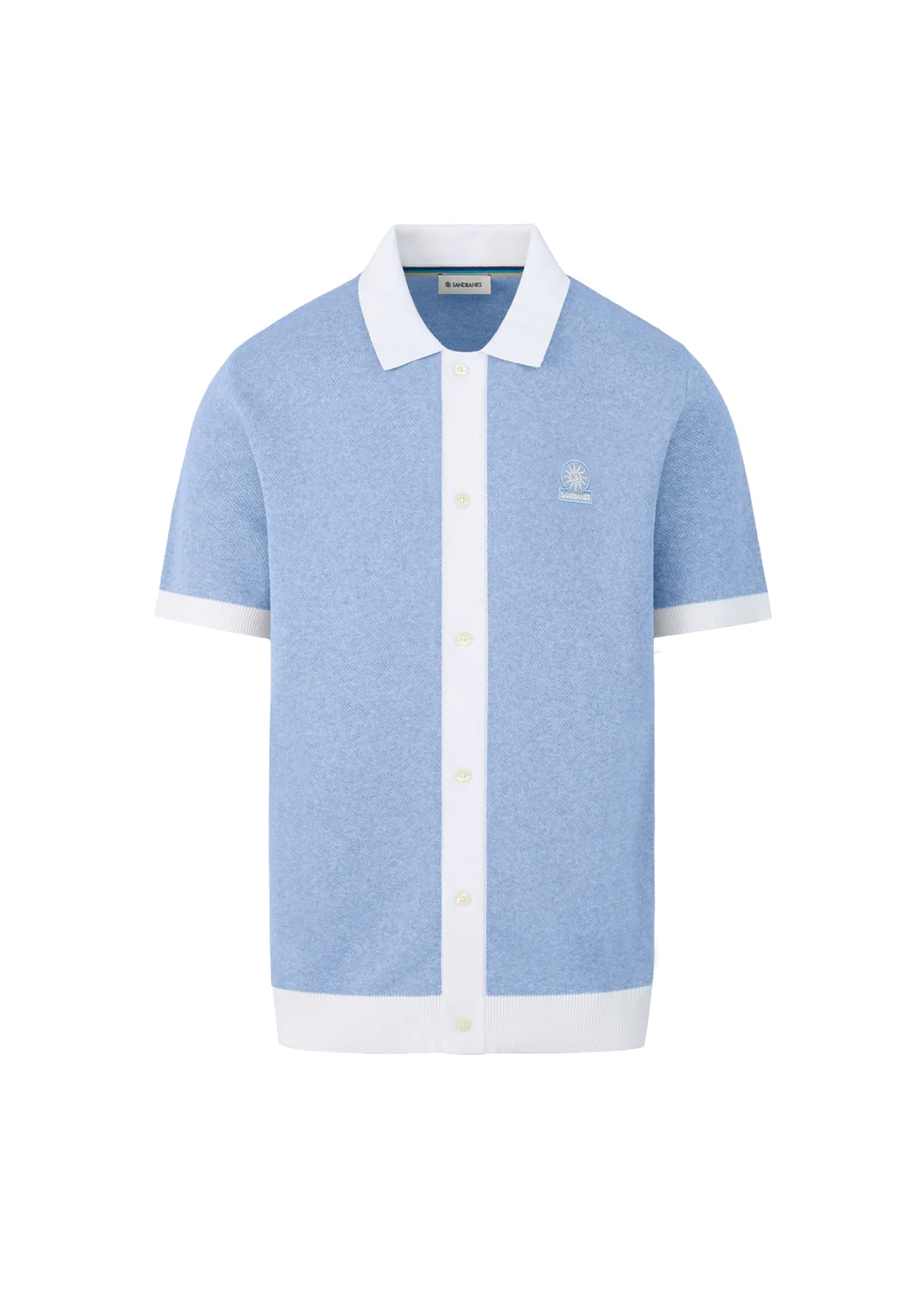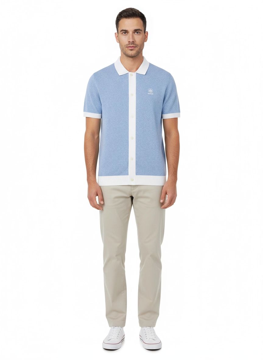 - Contrast collar, placket, cuffs, and hem