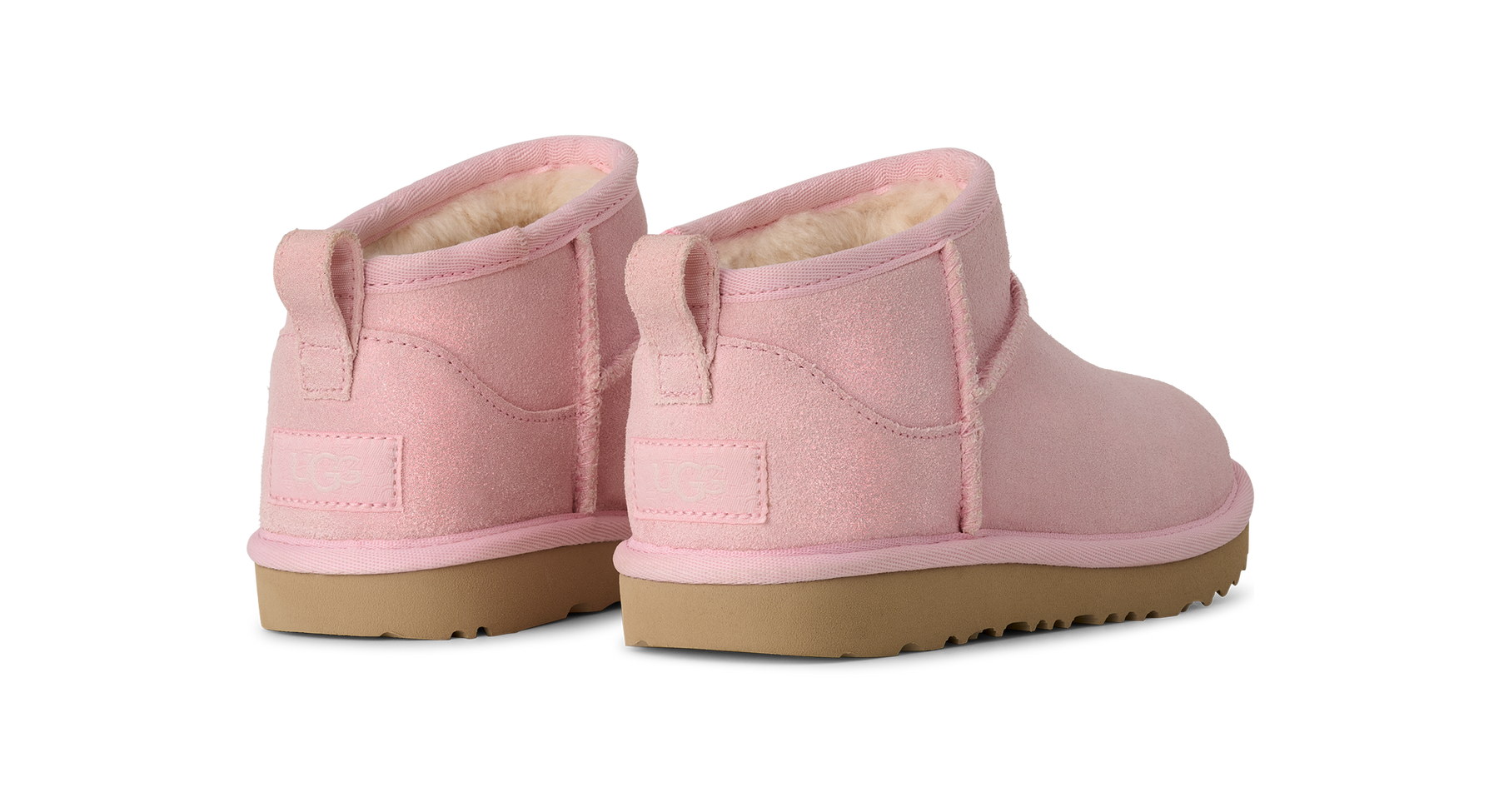 A sparkling twist on a fan favourite — the Classic Ultra Mini Dazzle brings shimmer and shine to the everyday. Designed with all the signature details kids love, this style features a soft UGGplush™ lining and insole made from a blend of upcycled wool and TENCEL™ Lyocell, plus a lightweight sugarcane EVA outsole for all-day comfort. The low shaft height makes it easy to slip on and off, while the foil print suede upper adds a touch of dazzle to any outfit.