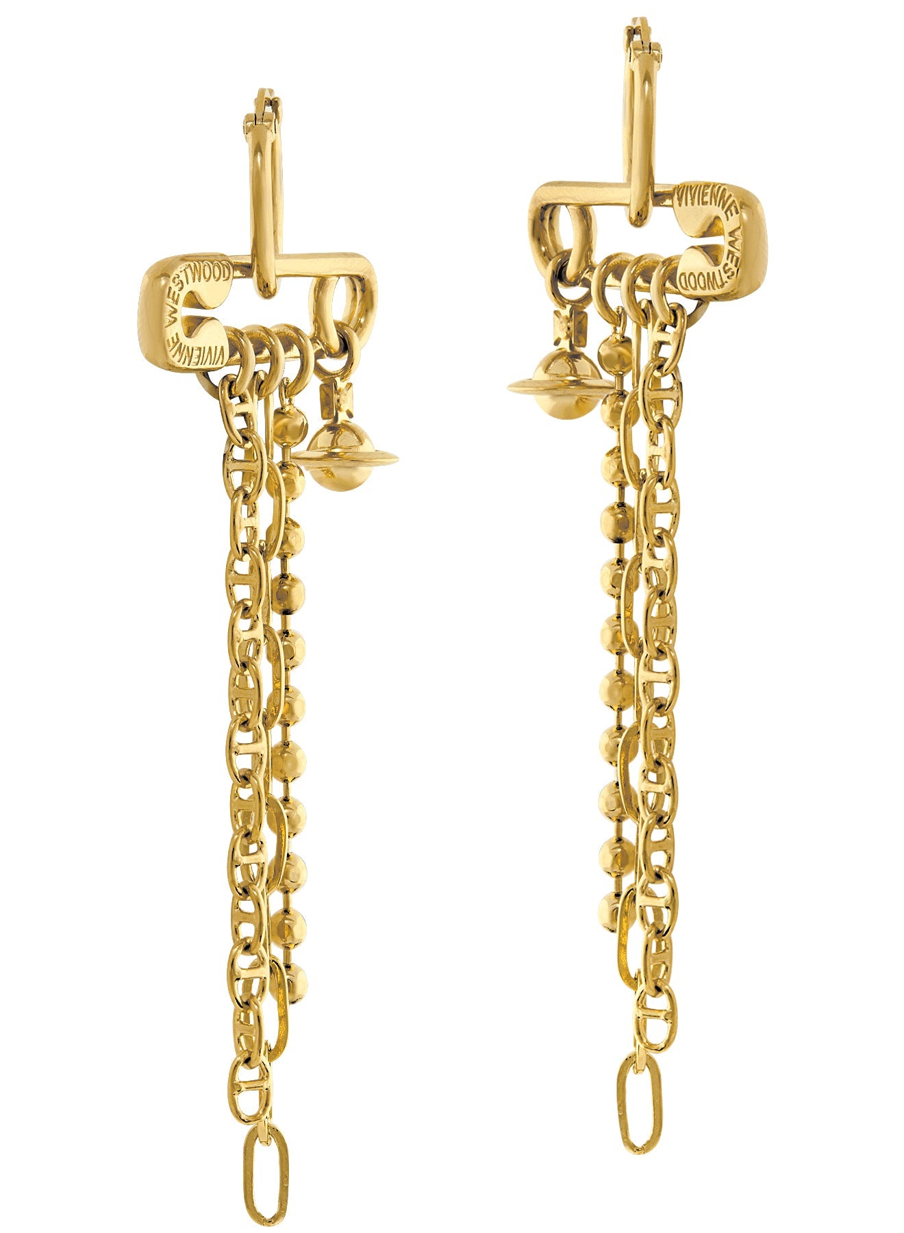Vivienne Westwood Ginetta earrings in gold-tone plating with cascading chain drops and hanging Orb finish. A high-movement drop earring suited to hair-up styling, leather jackets, open necklines, and bold evening looks.
