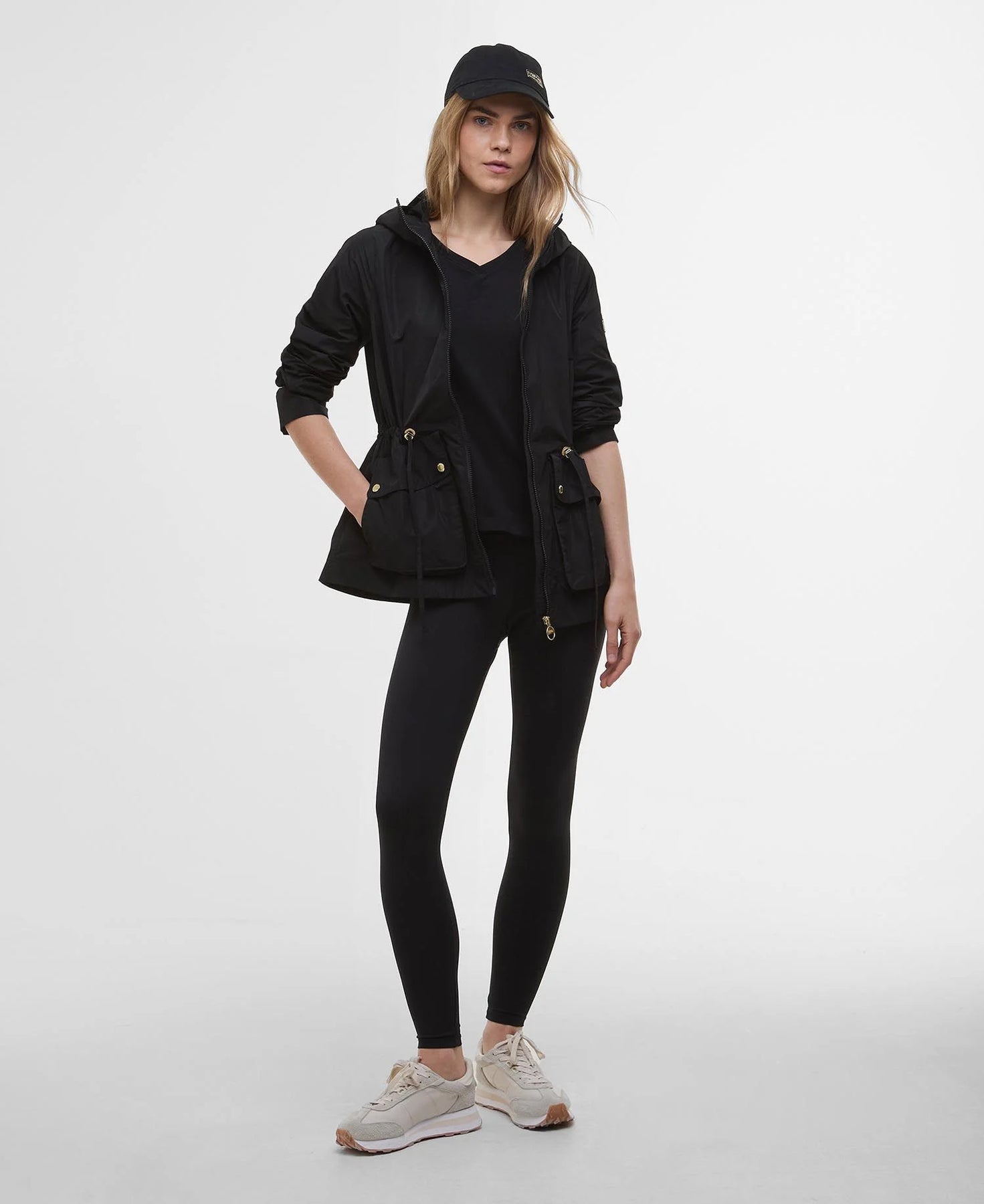 Women's Barbour International showerproof jacket constructed from 100% polyester with sheen finish. Unlined lightweight construction with non-detachable hood, double-entry patch pockets, waist drawcord and full-length centre-front zip closure.