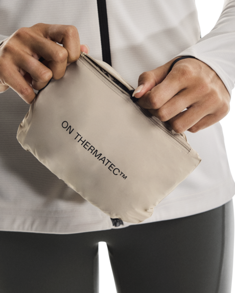 Woman wearing a beige and gray jacket with a visible On Running  brand logo on a white background
