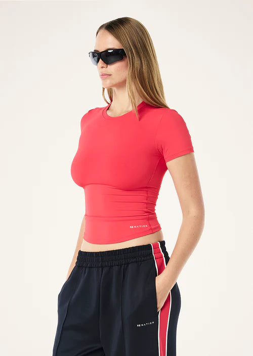 The Foundation Short Sleeve Tee in Strawberry Red is the ultimate wardrobe essential, blending comfort and versatility. Made from our ultra-soft BodyLuxe fabrication, this slim fit tee offers a smooth, buttery feel against the skin. With a clean crew neckline and minimal branding, it’s the perfect base layer, whether you're styling it with leggings, bike shorts, or layering under a blazer.