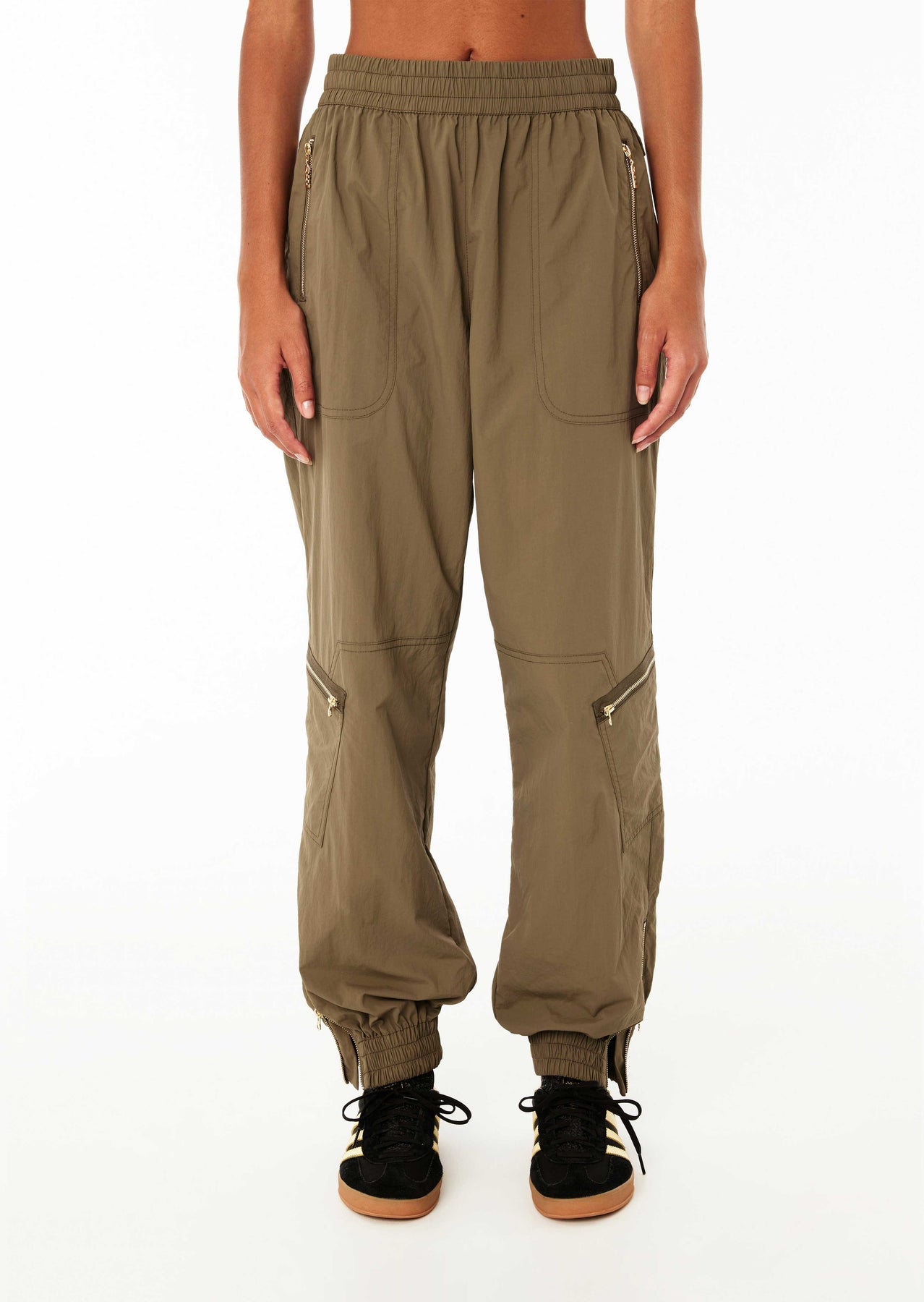 Experience comfort and style with our Women's P.E Nation Khaki Pitlane Cargo Pant. The relaxed fit and straight leg design with encased elastic waistband and cuffs provide ultimate ease and flexibility. Featuring multiple zip and patch pockets for convenience, these 100% nylon pants are perfect for any leisure wear.