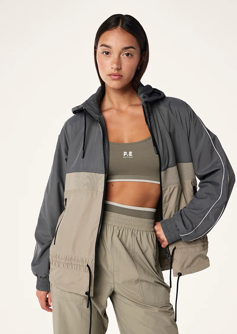 A woman wearing a gray and beige P.E Nation Man Down Gunmetal Jacket with contrast panelling, zip pockets, and a drawcord waist and neckline.