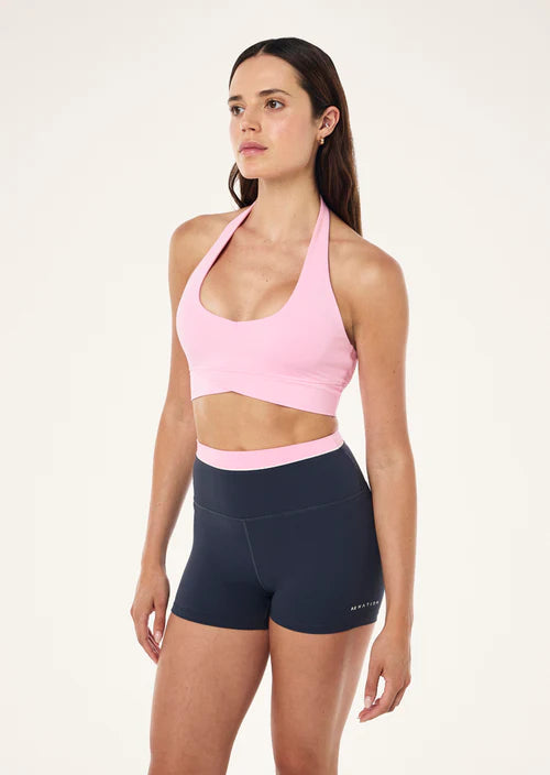 he Reset Halter Sports Bra in Prism Pink is made from our Active Lite fabrication with a lightweight, breathable feel designed to move with you. This style features a V-Neckline, removable cups, moderate compression for extra support and subtle P.E Nation branding. Style it back with the Reflect Bike Shorts for a elevated, performance-ready look.